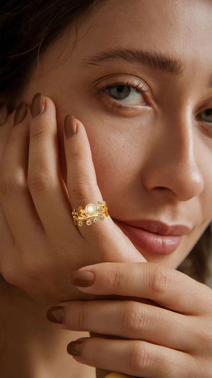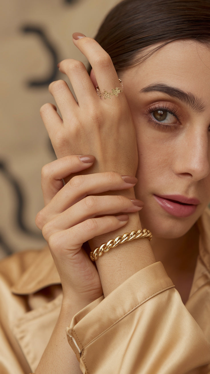 This gold-plated brass ring features set stones and hammered details for a contemporary and elegant look. Perfectly balanced between modernity and tradition, it complements your outfit with finesse. Maison Okami.